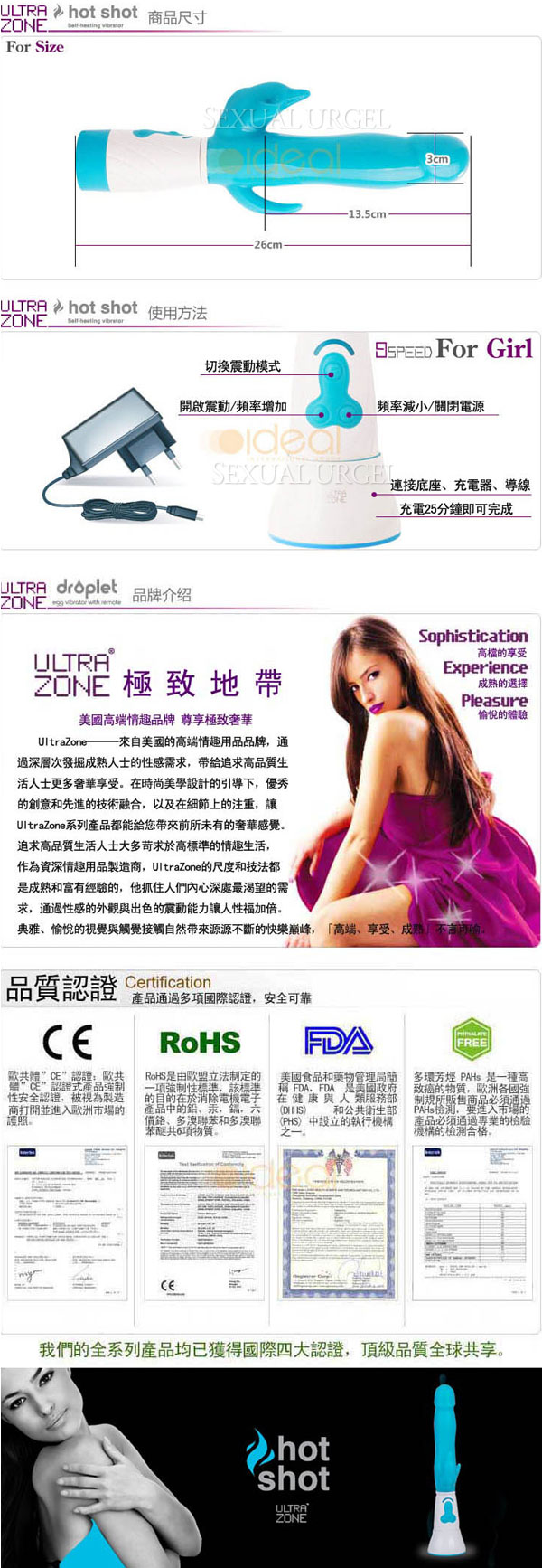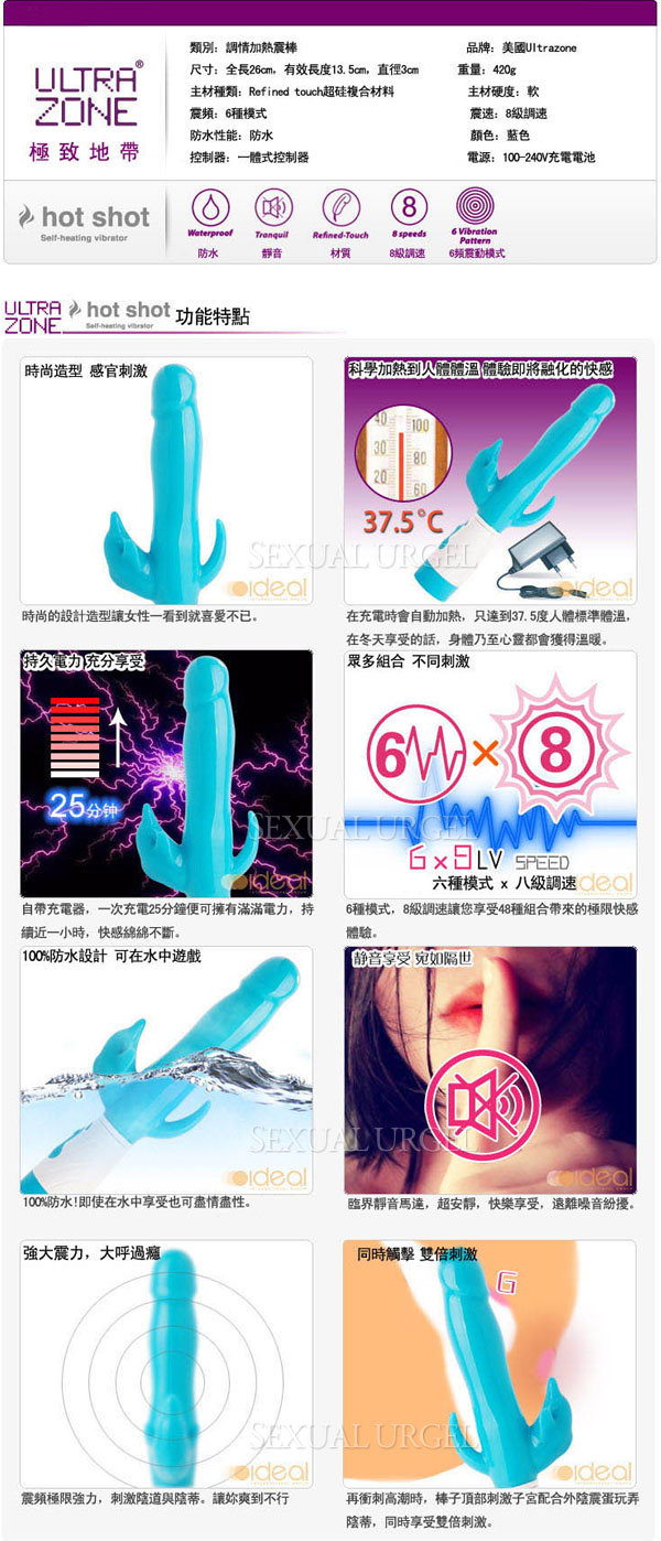.主商品:美國 Ultrazone Hot shot-Dolphin 跳躍海豚 加熱充電按摩棒-藍x1