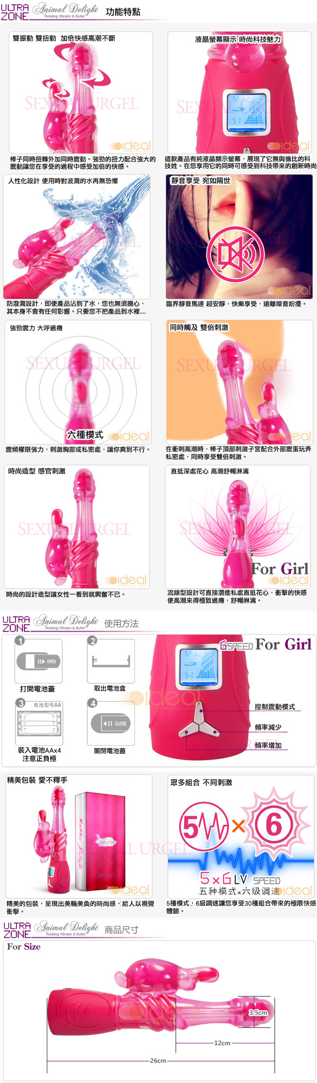 .主商品:美國Ultrazone-Rabbit Delight 瘋狂小兔 5x6變頻液晶旋轉按摩棒 x1