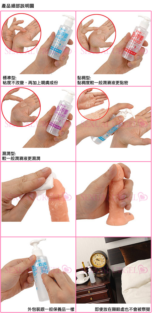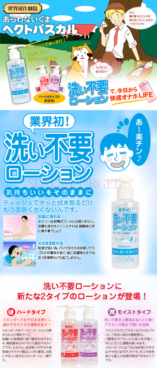 劃時代的新產品!!如同化妝水一般無添加香精卻極為清爽及兼具保濕感的潤滑液問市了~您還在為了使用自慰器後必需去清潔的掃興行為而感到煩悶嗎??這瓶潤滑液讓您可以在射精後即使不沖洗,也不會有令人不舒服的黏膩感;現在您就可以開始體驗這種"帶著射精後的滿足快感"輕鬆入睡的感覺了。