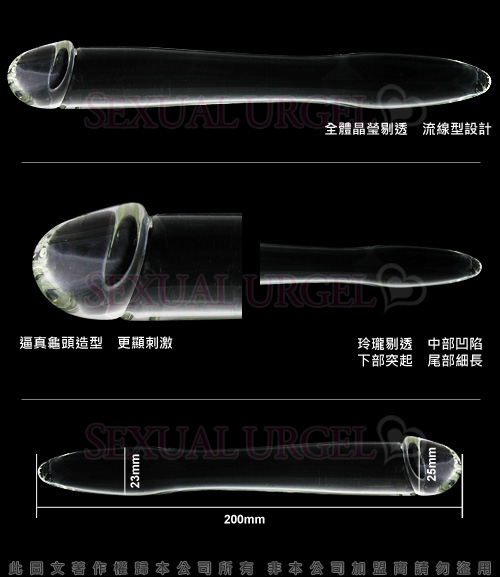 兩頭均可使用,超長設計,長度達到20CM,逼真龜頭造型,更顯刺激,冠溝處圓潤,流線,全然不會劃傷體內柔嫩的肌膚。玲瓏剔透,中部凹陷。下部突起,尾部細長。完美外觀,極致快感享受。細緻,典雅,渴望安慰。