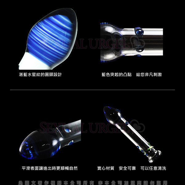 流線型圓滑設計,湛藍水星紋的圓頭設計,藍色的凸點,給你非凡刺激,平滑表面讓進出時更加順暢自然,全然不會劃到體內柔嫩的肌膚。