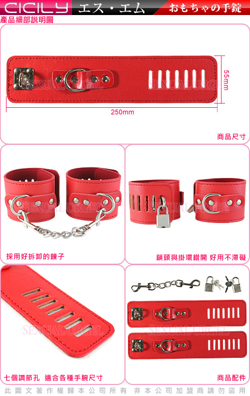 .商品內容:虐戀精品CICILY-紅色M女-俘虜手銬(帶鎖)   X1