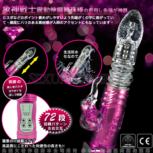 最新強力電動伸縮按摩棒,可同時震動陰道、陰核,震動力強勁!耐用、耐操,同時可震動,遠遠超越了男性陽具所能發揮的體能極限,強烈的戳幹力,幾乎讓人無法一手掌握,再怎麼強烈的燎原慾火,也會被它所撲滅夷平。中間的環紋部分不停地伸縮、抽動,在您的私處進出、摩擦;小象長長的鼻子拍打、添吸著您最敏感的陰蒂……