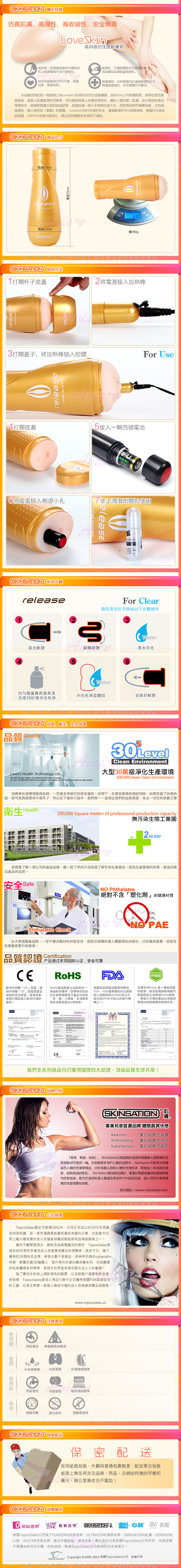 loveskin在世界上被公認為是安全、無毒、環保、觸感真實的情趣用品材質的先行者,多用於男用情趣用品。產品通過歐美多項環保和安全認證,不含任何有害物質,男士們請放心使用。