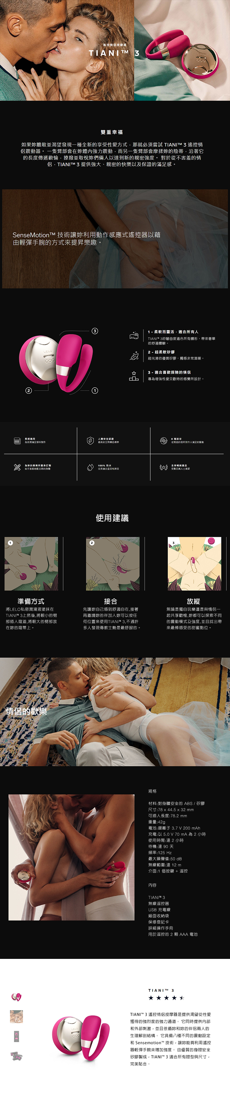 蒂阿妮3是LELO紅點至尊獎獲獎產品蒂阿妮的全新升級產品,是專為做愛時由女性佩戴而設計的情侶按摩器。升級改進後的馬達動力更強勁,振動更精準,帶給陰蒂更貼切的感官刺激;如絲般光滑細膩的矽膠設計帶給您最美妙的快樂與舒適感受。
