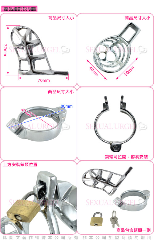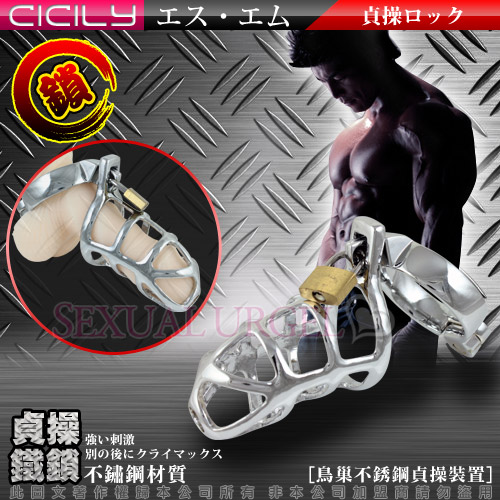 冰冷的金屬,是否降低愛人的欲望?一個金屬鳥籠加上一個卡環,將愛人牢牢鎖住,流暢的線條,厚實的金屬質感,可以防止手淫等行為,是非常時尚的sm貞操帶,可以全天候長時間穿戴。