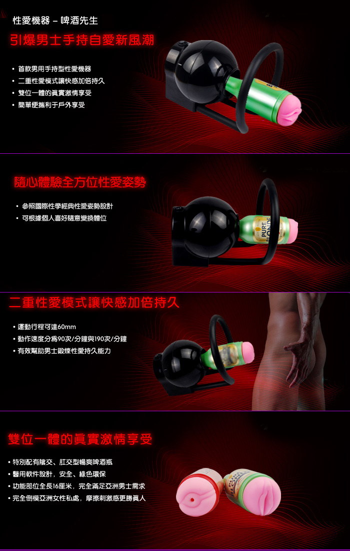 1、 首款男用手持型性愛機器,重砲先生功能部分特別採用男士喜愛的啤酒瓶外觀設計,讓男士在激情飽滿的性愛過程中感受如同暢飲醇正啤酒時的舒爽。