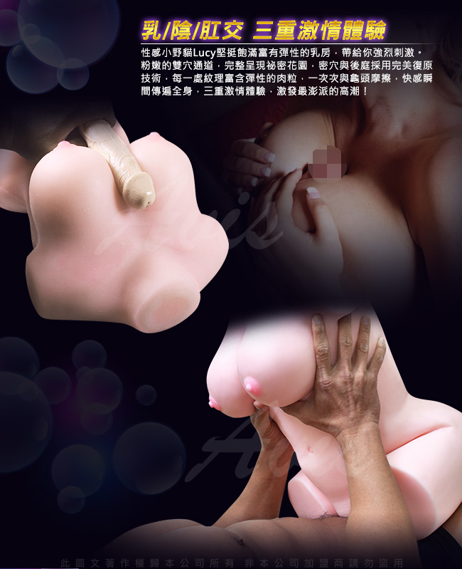 外形設計優美,線條流暢,豐滿的雙乳讓你盡情把玩絕對的手感;仿真3D構造女性陰部、嬌美陰唇的毫無保留的呈現,細緻嬌嫩,陰道設計窄緊,超柔軟的彈性體仿真得讓你無法分辨真假;豐滿的線條,性感的視覺效果……讓你隨時都有一個充滿激情與浪漫夜晚。還有喜歡更緊實的後庭性愛,絕不能錯過了,內部一樣也是3D構造喔