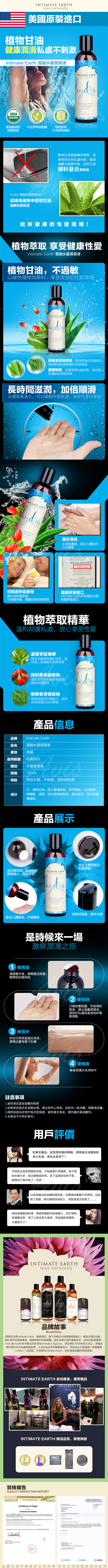 INTIMATE-EARTH的潤滑液混合物含有經過認證的的純天然蘆薈,檸檬香茅提取物,枸杞提取物,完全純天然成份。