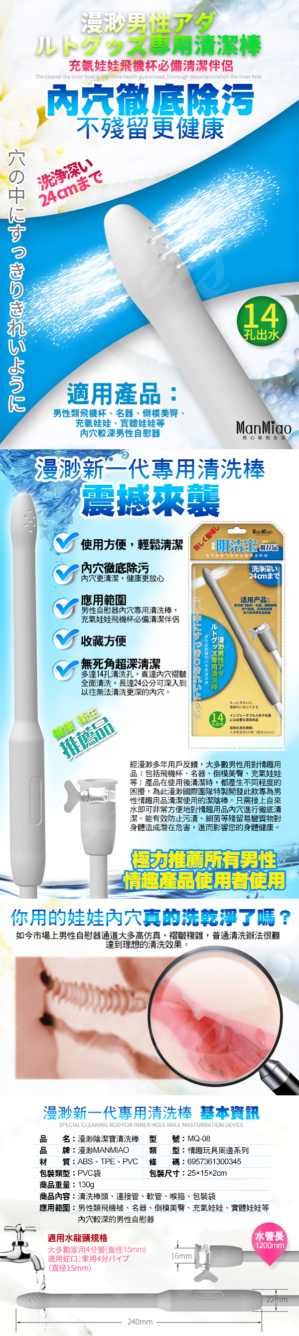 經漫渺多年用戶反饋,大多數男性用對情趣用品(包括飛機杯、名器、倒模美臀、充氣娃娃等)產品在使用後清潔時,都產生不同程度的困擾,為此漫渺國際團隊特製開發此款專為男性情趣用品清潔使用的潔陰棒。