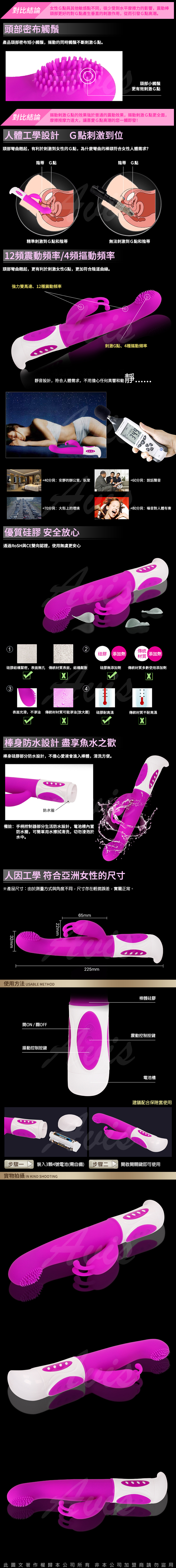 本產品突破傳統震動棒設計侷限,頭部採用G點摳摳設計,即為蠕動設計
