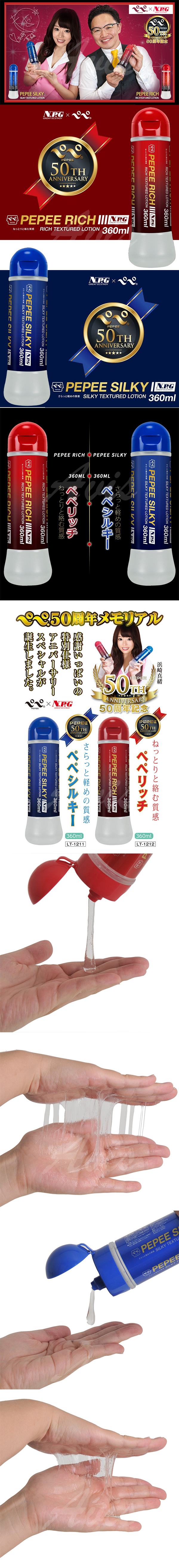 著名生產商中島50周年企劃產品,聯同N.P.G共同推出兩款高品質潤滑劑,見證一個時代誕生!由人氣女優浜崎真緒和人氣男優森林原人為你極力推薦,紅色RICH代表濃厚,豐盈的觸感。含有較高黏度和保濕力,將潤滑能力發揮到極致。