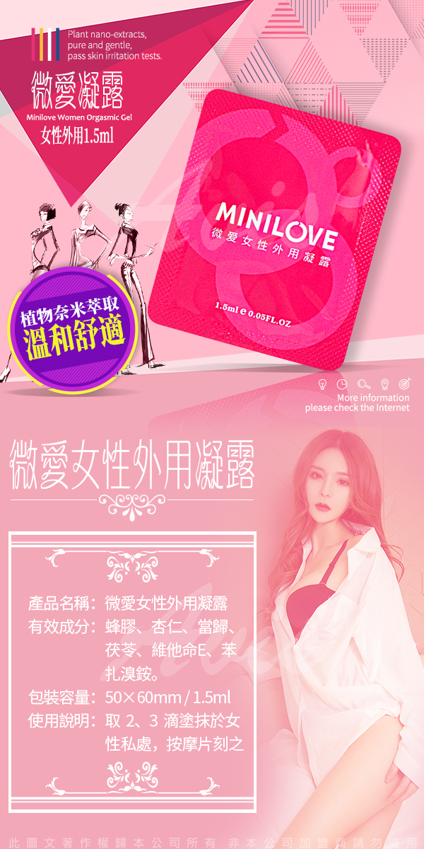 .主商品:MINILOVE 女用高潮助情液 女性情趣提升凝露 女用快感提升液 1.5ml x10包 .容量:單包1.5ml