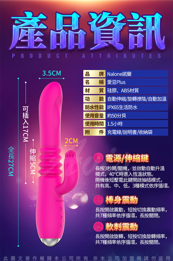 .商品名稱:香港Nalone-愛豆Plus 智能加溫7段變頻旋轉軟刺伸縮按摩棒