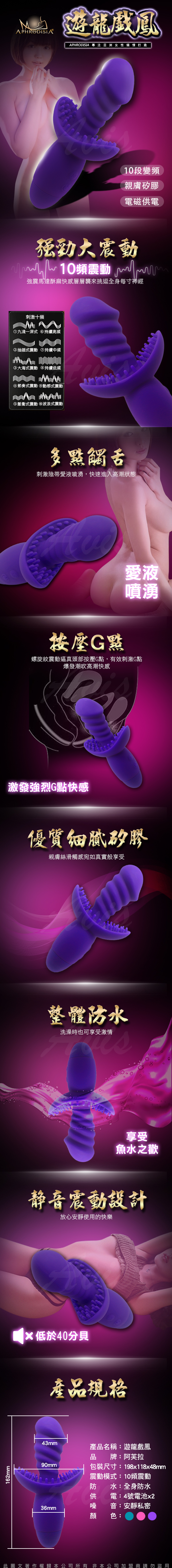 .主商品:APHRODISIA.Wild Ride 遊龍戲鳳 10段變頻防水情趣按摩棒(電池款)-紫色