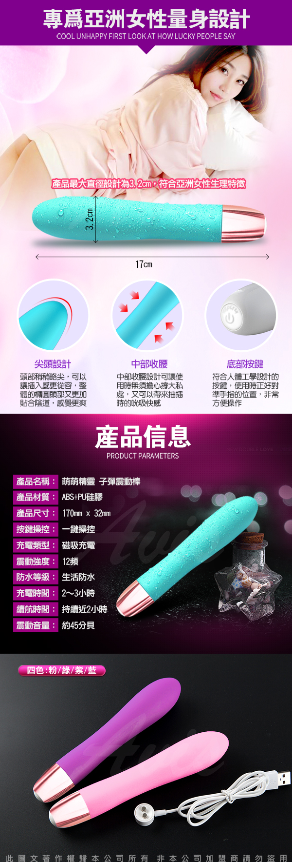 .商品顏色:粉/紫/綠/藍