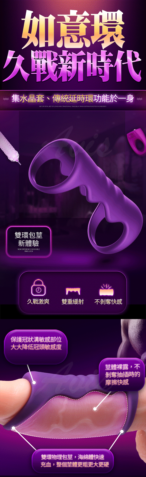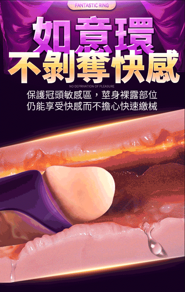 如意環設計保護冠狀溝敏感部位大大降低龜頭敏感度,莖體裸露不剝奪抽插時的摩擦快感,柔軟矽膠舒適耐用。可全身水洗讓您可以在沐浴時與伴侶自由享用,隨時滿足您的愛慾喔