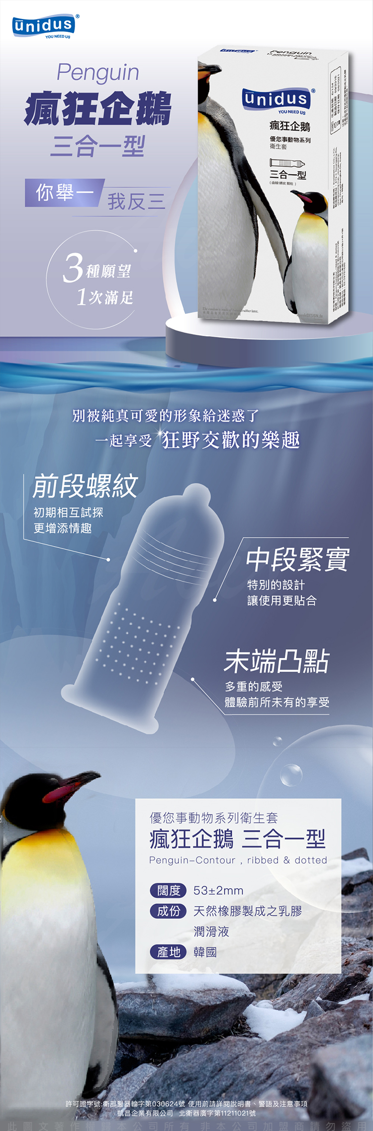 unidus優您事 動物系列保險套-瘋狂企鵝-三合一型 12入