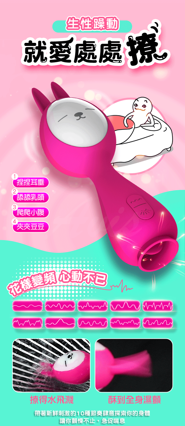 萌兔有猛招,一頭軟舌蜜舔,一頭深入激顫拍打輪番上陣,激情到難以抑制。帶著10種新鮮刺激的變頻節奏肆意探索您的身體,讓您顫慄不已。為全矽膠無骨設計,可隨意彎曲輕鬆探索身體敏感點。擁有防水低噪讓您夜夜潮來潮去都不怕,事後清洗也方便喔~