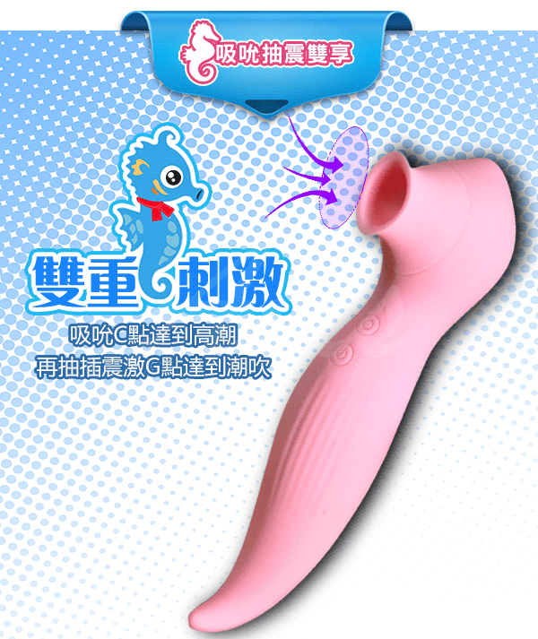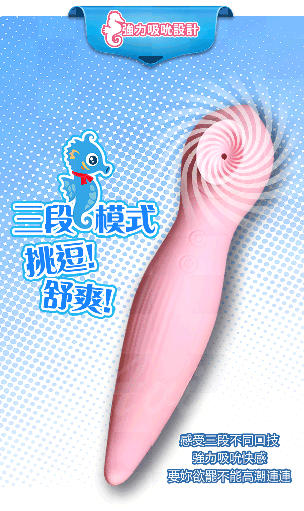 根據研究發現女性性高潮主要分為陰蒂高潮和G點高潮,然而性生活中女性很少能體驗到陰蒂高潮帶來的快感。為了解決女性的這種痛點,根據海馬吮吸的進食習性和獨特小巧精緻的外形,並結合人體工程學、美學,從而設計出此款可吮吸的8震+3吸震動棒。產品依潮流的使用馬卡龍色系,吮吸與震動的雙重功能,獨特的外形,給您帶來美與陰蒂的高潮。