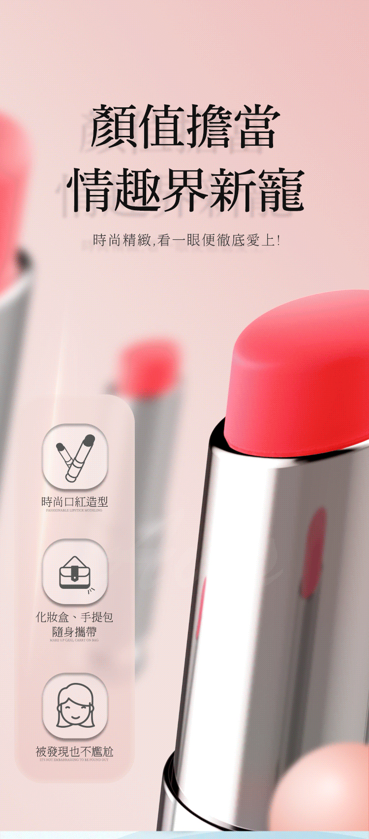 設計成逼真口紅造型,造型小巧讓您可隨處攜帶隨處放避免被看見時的尷尬。