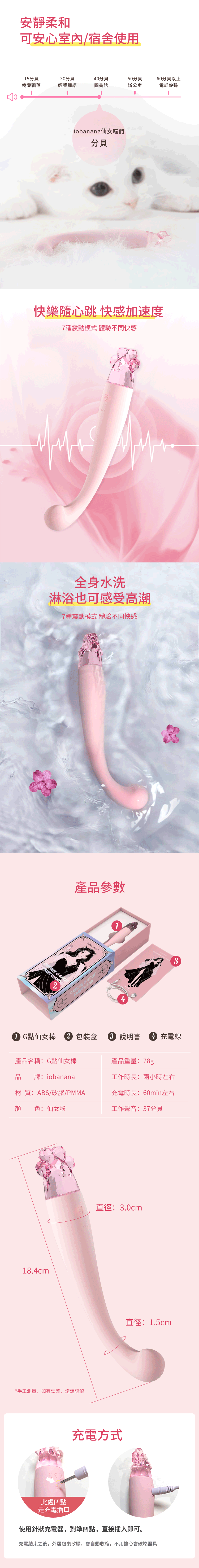 產品名稱:iobanana-G點仙女棒 喵掌 健康按摩棒產品重量:78g品牌:iobanana 工作時長:兩小時左右材質:ABS/矽膠/PMMA 充電時長:60min左右顏 色:仙女粉 工作聲音:37分貝