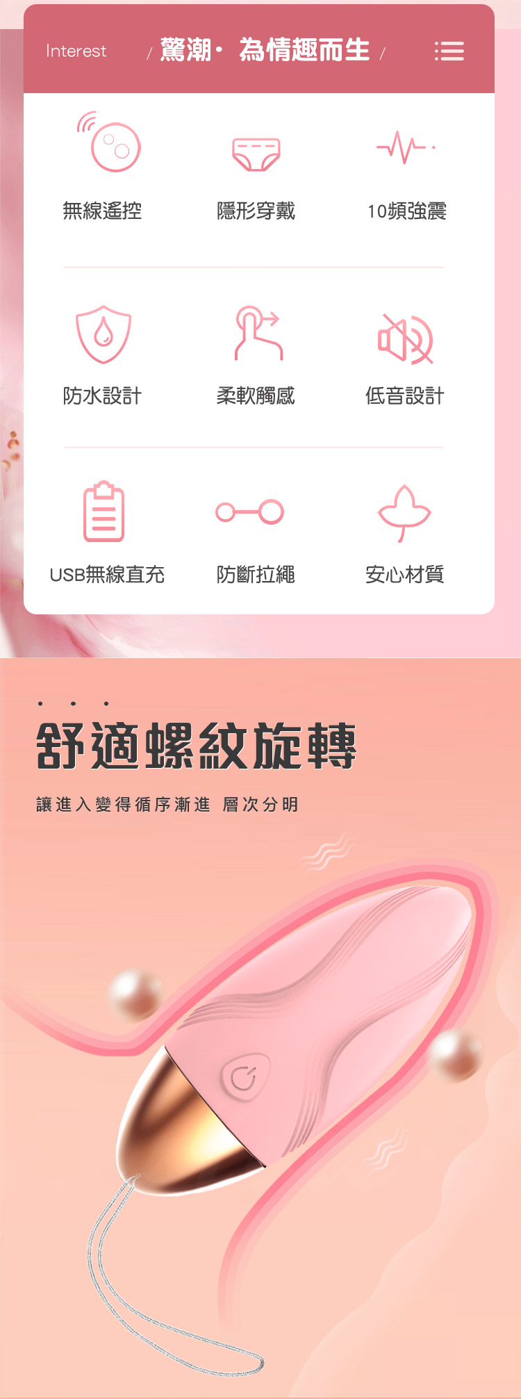 名稱:驚潮 10段變頻柔軟矽膠遙控跳蛋-粉色