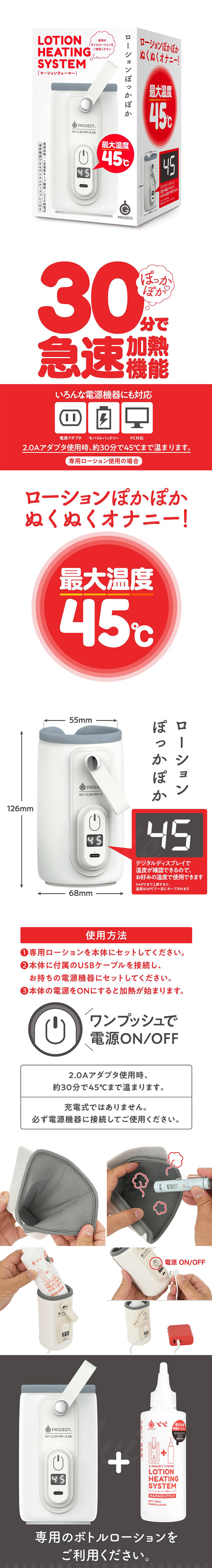 ※使用2.0A插座時。可以在數字顯示屏上確認溫度,因此亦可以按照自己喜歡的溫度來使用!當溫度上升至45度時,會恆定保持在45度。不需擔心加熱過頭!兼容電源插座、行動電源、電腦等各種供電設備!無論是在何時何地,都能享受溫熱的潤滑液,溫熱的快樂時光!