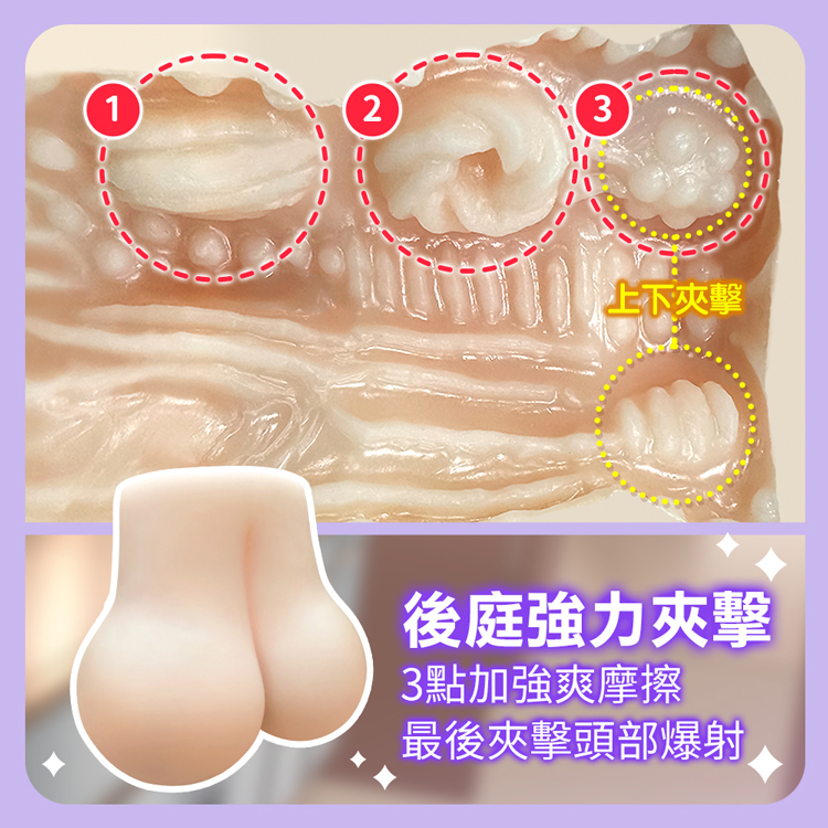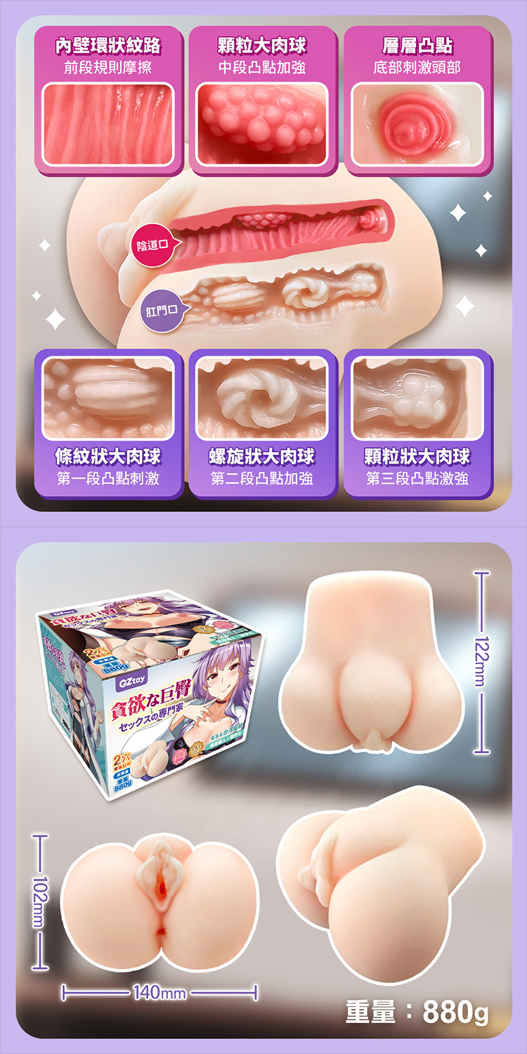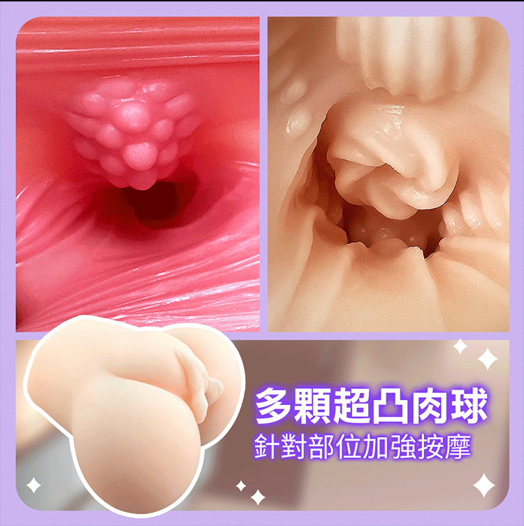 內部設計精細,內壁的環狀紋路帶來前段規則摩擦效果,搭配顆粒狀大肉球,前中段凸點層層加強,讓刺激感遞增。陰道與肛門兩個通道選擇,各具不同的紋路設計。螺旋狀大肉球與顆粒凸點的完美結合,形成層層刺激。底部設計針對頭部的強烈按摩效果,讓每次進入都充滿高潮的期待與享受。