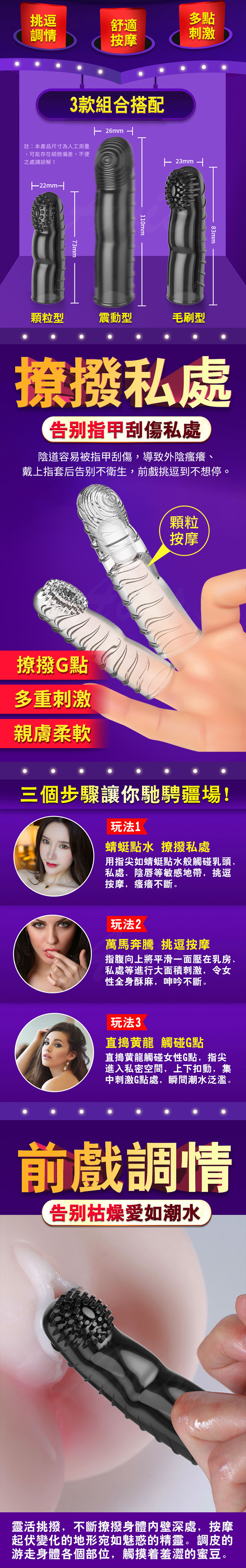 產品名稱:取悅|挑逗震動手指套3入|透明品牌:取悅 顏色:透明黑、透明白材質:TPE、ABS產品功能:調情 產品淨重:約43g包裝内容:手指套3個、跳蛋1個