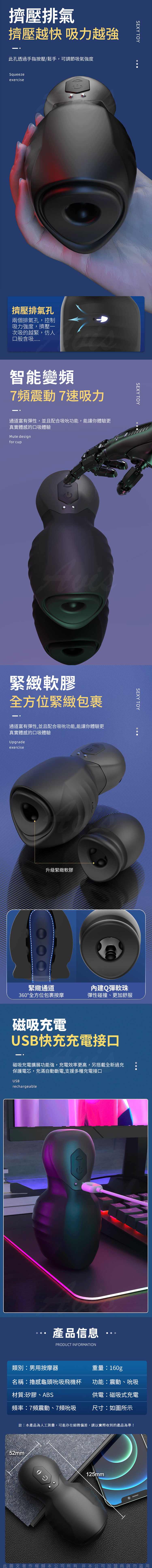 - 吸吮摩擦訓練強:強力吸吮和摩擦設計,協助您進行有效訓練,提升持久力和敏感度。