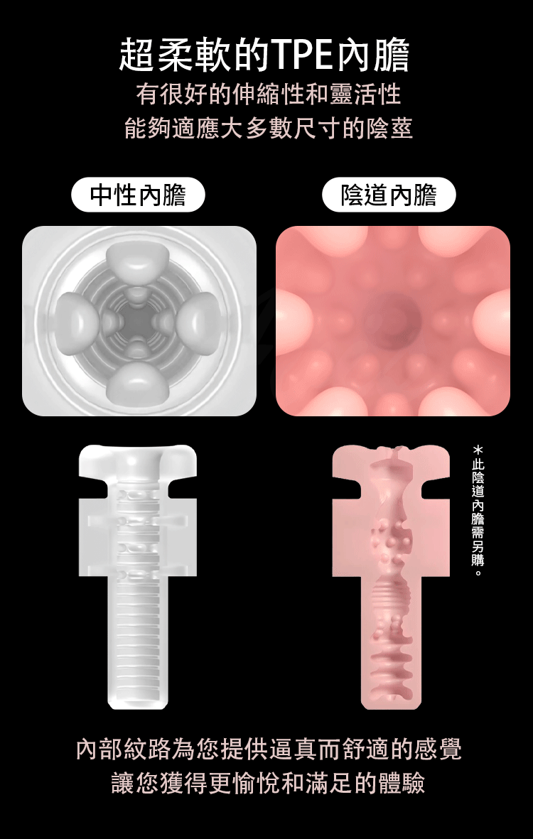- 超柔軟TPE內膽:選用高品質TPE材質,具備卓越的伸縮性與靈活性,可完美適應大多數尺寸的陰莖,讓每一次使用都更加貼合。