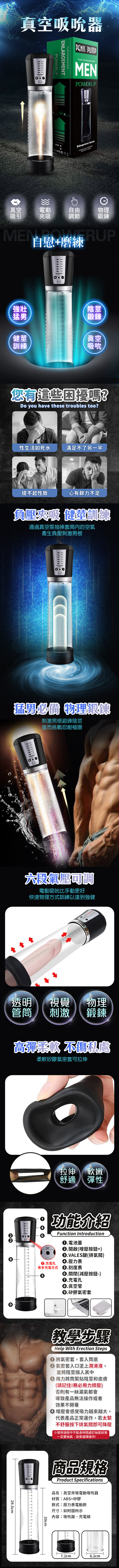 品名:MEN|真空電動|鍛鍊訓練器 電動吸吮器材質:ABS+矽膠款式:壓力表電動款尺寸:如附圖所示內容:吸吮器 ×1、充電線 ×1
