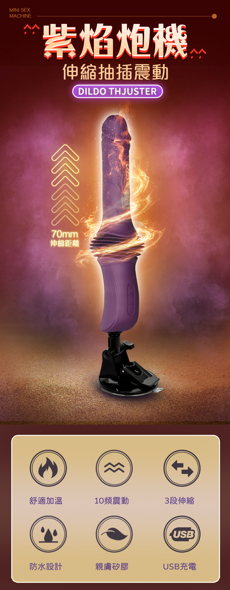 以「力量 × 節奏 × 深度」為核心打造的紫焰炮機,透過 70mm 大幅度伸縮。